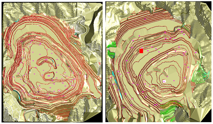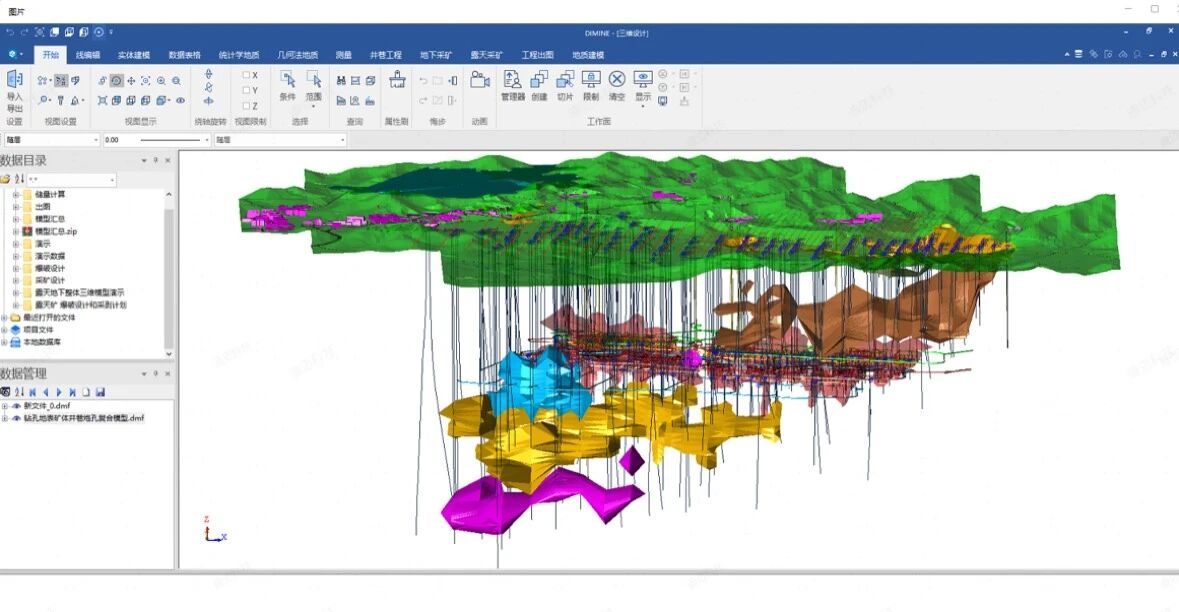图1-利用DIMINE构建包含地形、矿体、边坡等要素的三维实体模型